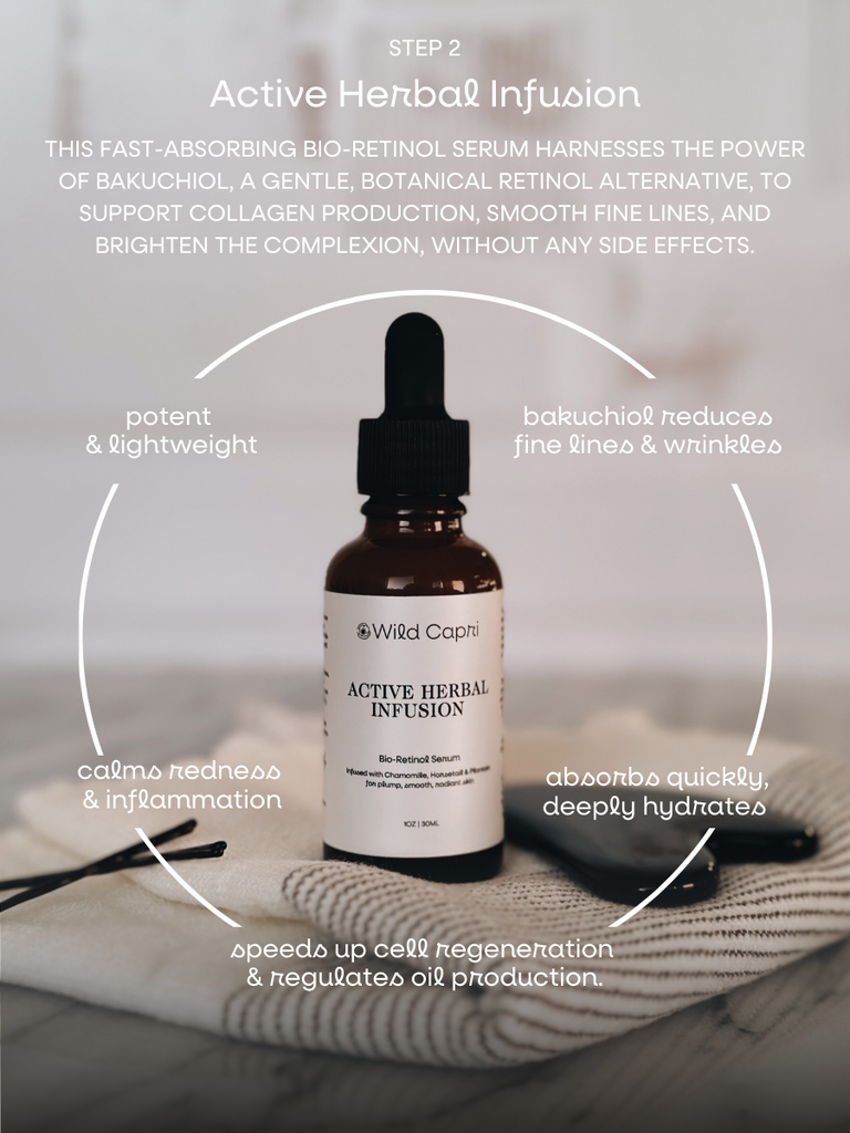 Potent and lightweight, the Active Herbal Infusion Bio-Retinol Serum is a transformative addition to your skincare routine. This fast-absorbing gel serum harnesses the power of Bakuchiol, a gentle but potent botanical retinol alternative. Boost collagen production, smooth fine lines and brighten the complexion without any side effects. Infused with healing botanicals like chamomile, horsetail, and plantain, this serum works to calm inflammation, redness and balance oil, leaving skin refreshed, plump, and glowing.