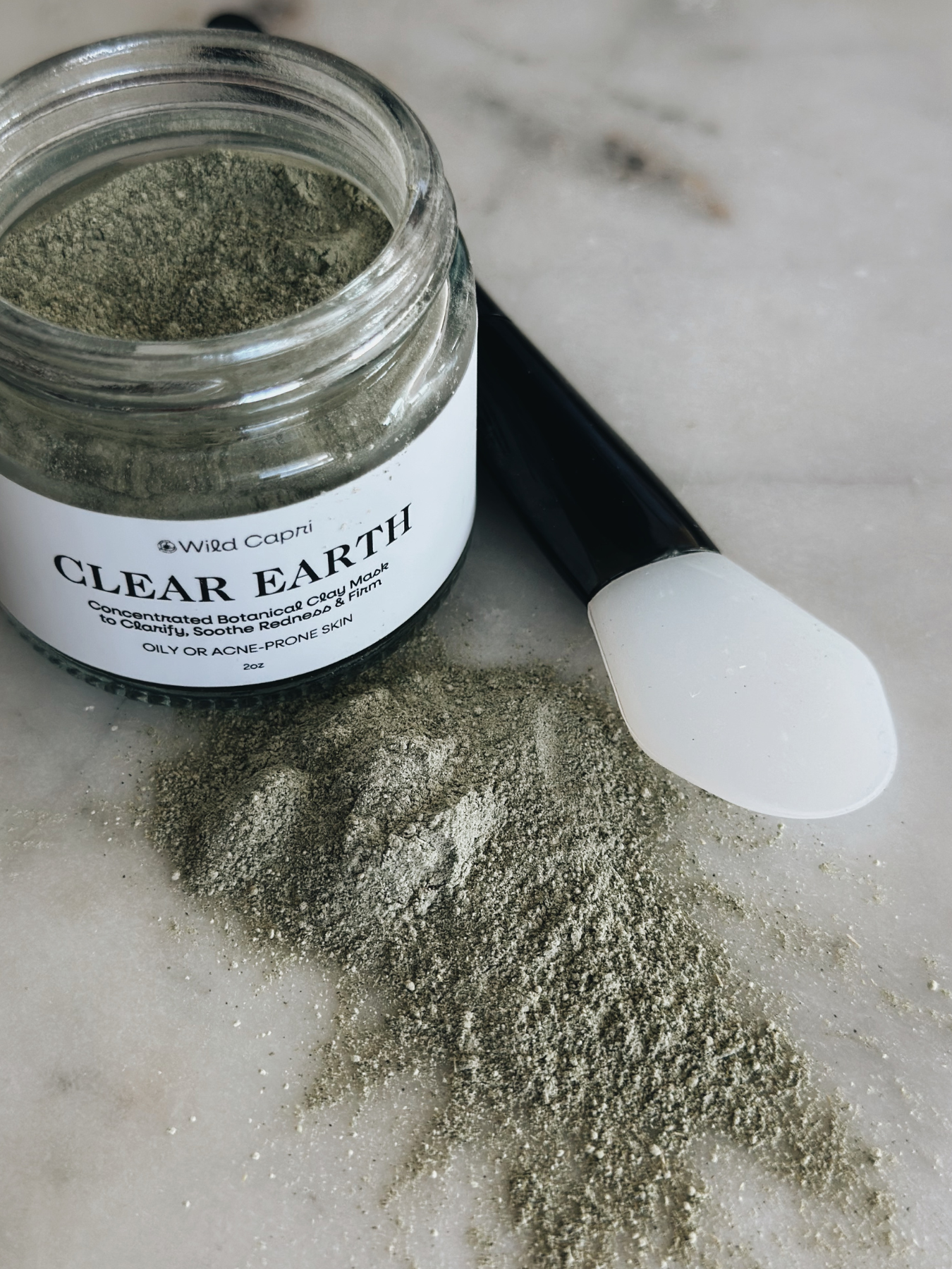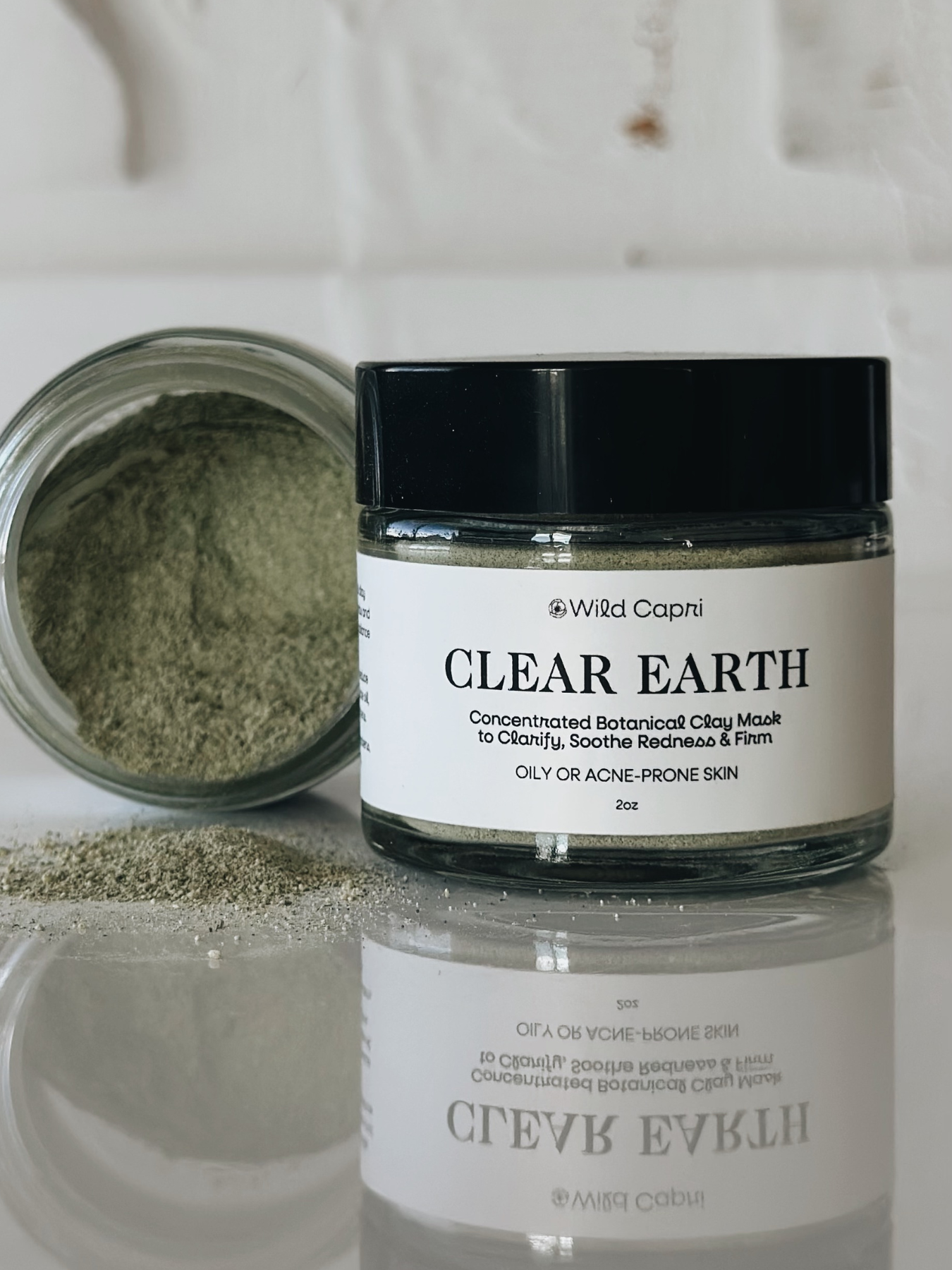 Our concentrated botanical Clear Earth Clay Mask combines French green clay for deep detoxification with colloidal oatmeal and organic herbs — matcha, nettle, yarrow, Oregon grape root, and alfalfa — to absorb excess oil, calm inflammation and support a clearer, healthier complexion with refined pores and balanced hydration.