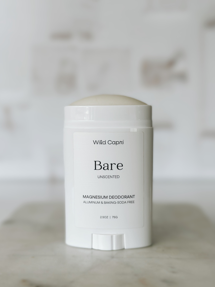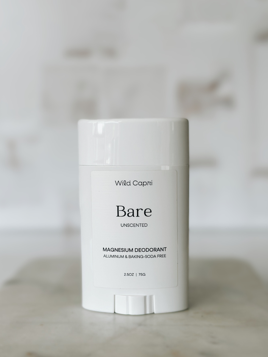Bare is a truly unscented, essential oil–free, magnesium + prebiotic-based deodorant that offers reliable odor protection and microbiome support without irritating or overwhelming your skin. With no fragrance and no fluff, it’s just clean ingredients that work.