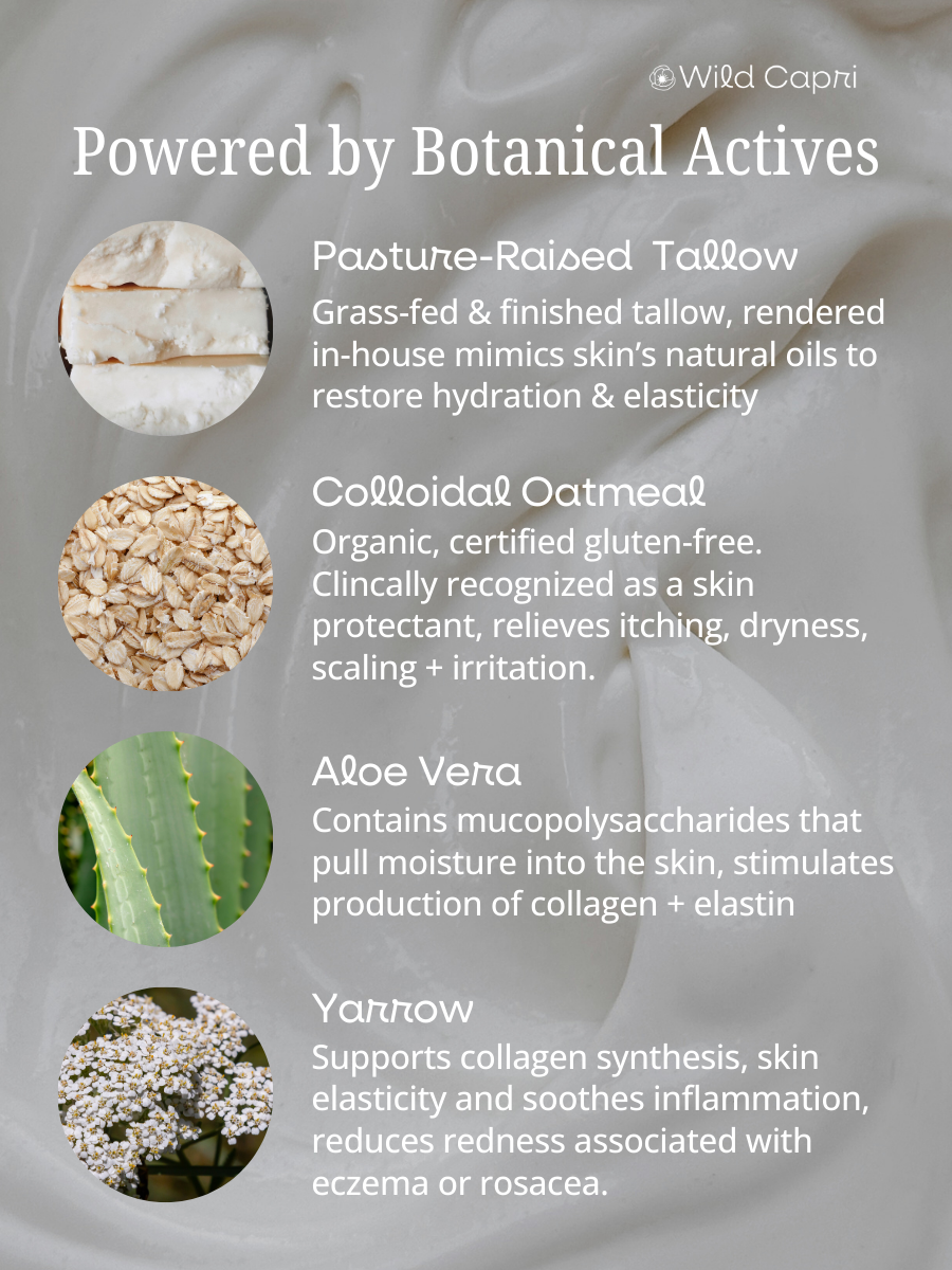 This slow-made, non-toxic formula blends nutrient-rich tallow, organic colloidal oats and botanicals to therapeutically hydrate, calm, and repair the skin - without greasiness. Gentle enough for daily use with long lasting moisture. Rich enough to replace your body butter.