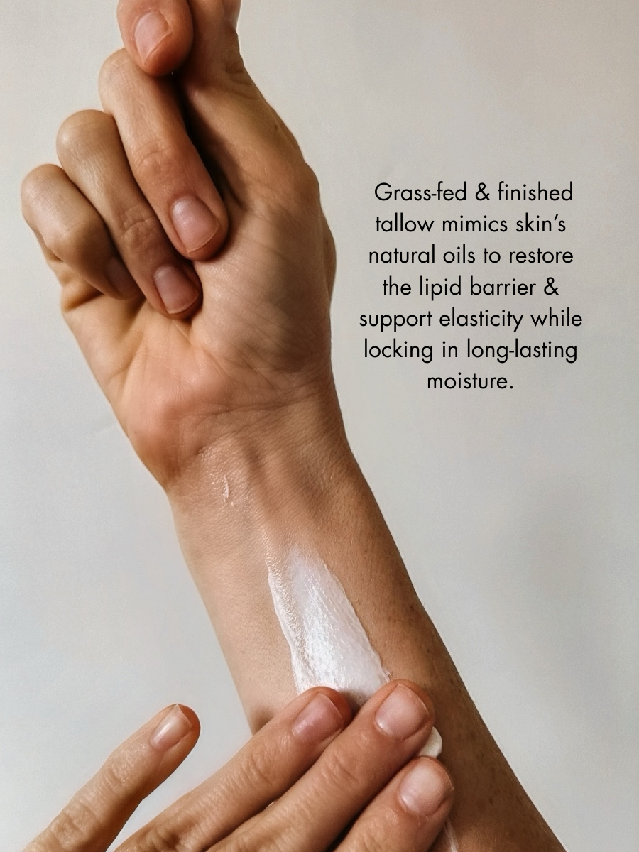 Supports collagen integrity and deep dermal hydration. Mimicking your skin’s natural sebum and lipid profile, our tallow melds with your skin -providing a therapeutic moisturizing properties that balances oil production, soothes dry spots and penetrates beyond the surface.