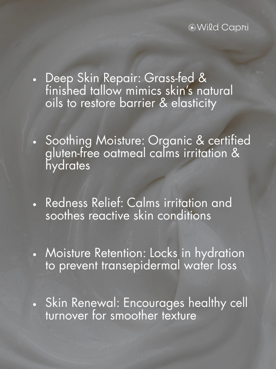 This slow-made formula blends nutrient-rich tallow, organic colloidal oats and botanicals to therapeutically hydrate, calm, and repair the skin - without greasiness. Gentle enough for daily use with long lasting moisture. Rich enough to replace your body butter.