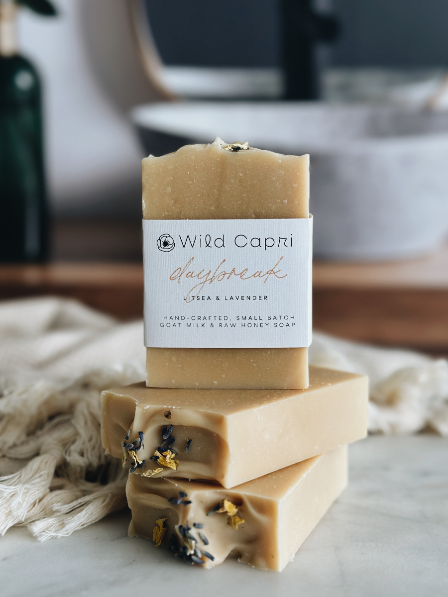 Introducing our energizing and purifying Daybreak Goatmilk + Raw Honey Soap! This soap combines the refreshing & cleansing lemony zest of Litsea and the calming essence of Lavender, creating a summer-inspired scent