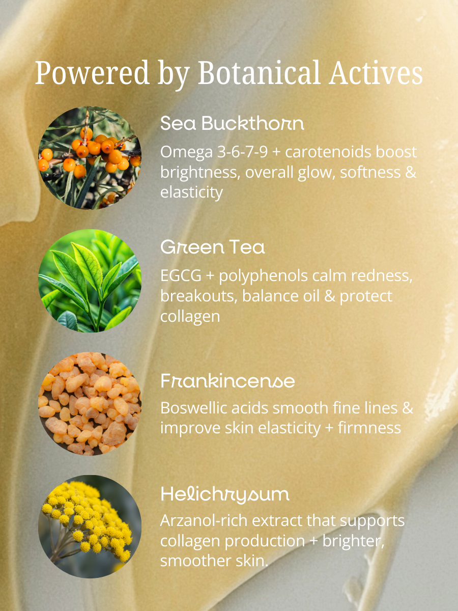 A rich, rejuvenating overnight cream powered by sea buckthorn, green tea, frankincense, and helichrysum - formulated to visibly restore skin's natural glow, replenish essential lipids, and support skin’s natural renewal while you sleep.