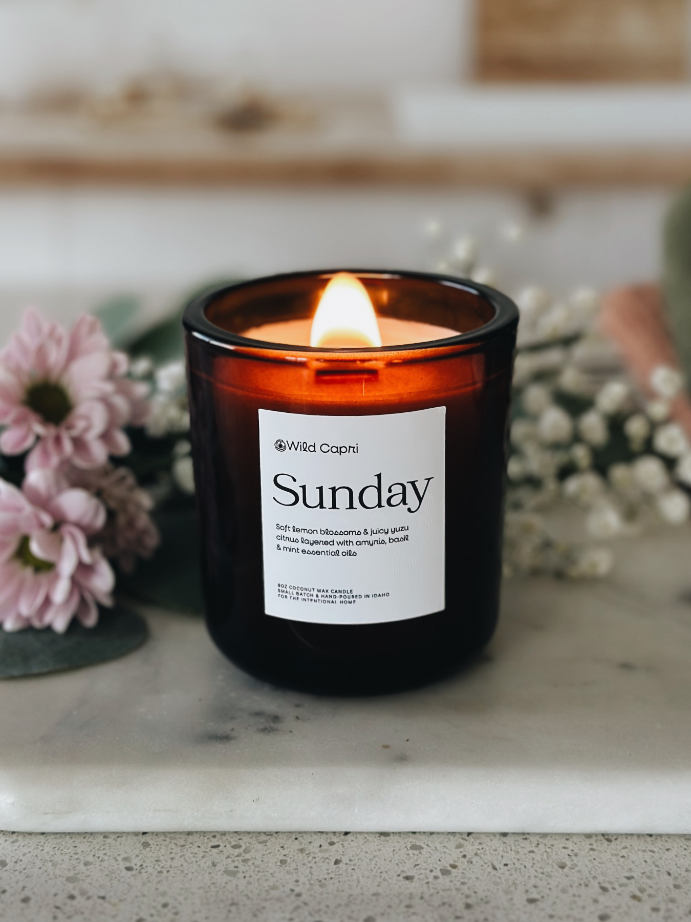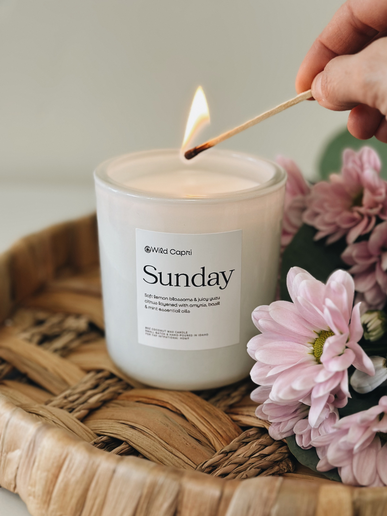 Meet Sunday. Lively and fresh, this candle opens with soft lemon blossom and juicy citrus, balanced with a touch of fresh basil, clean mint and soft vanilla undertones. It’s the kind of scent that lingers, effortlessly bright and inviting.